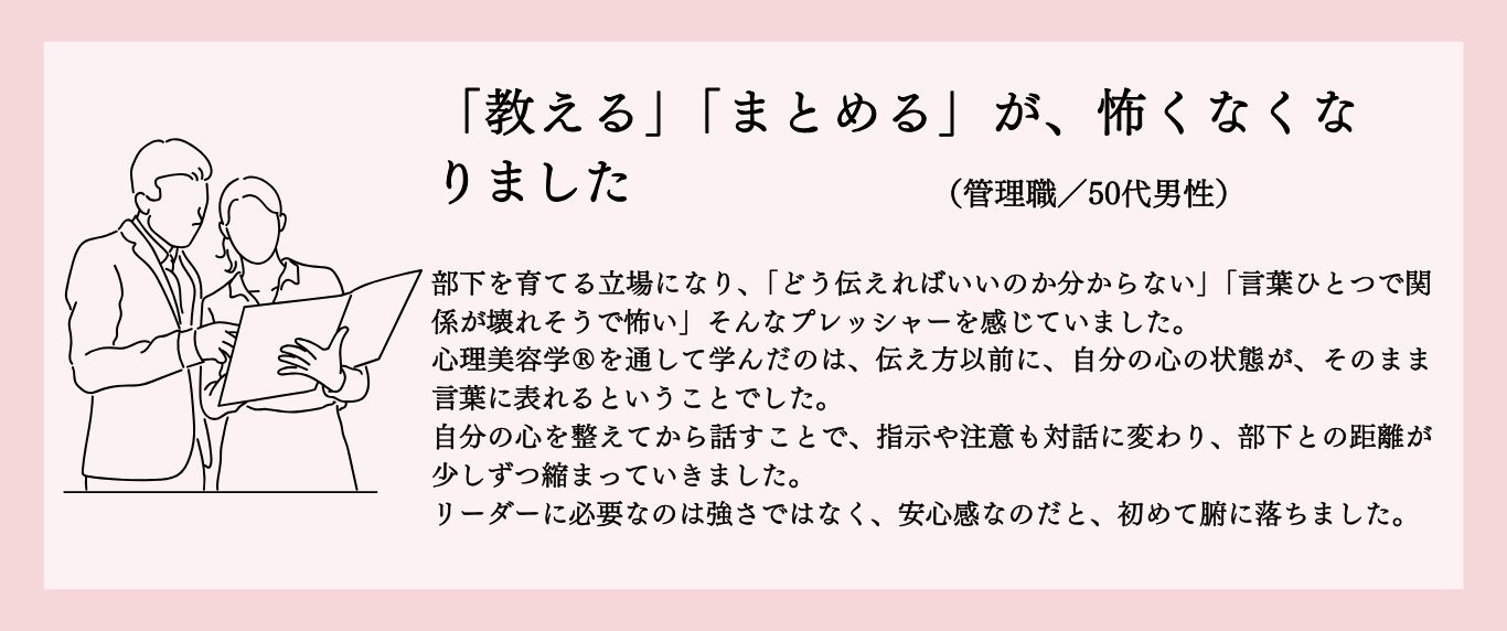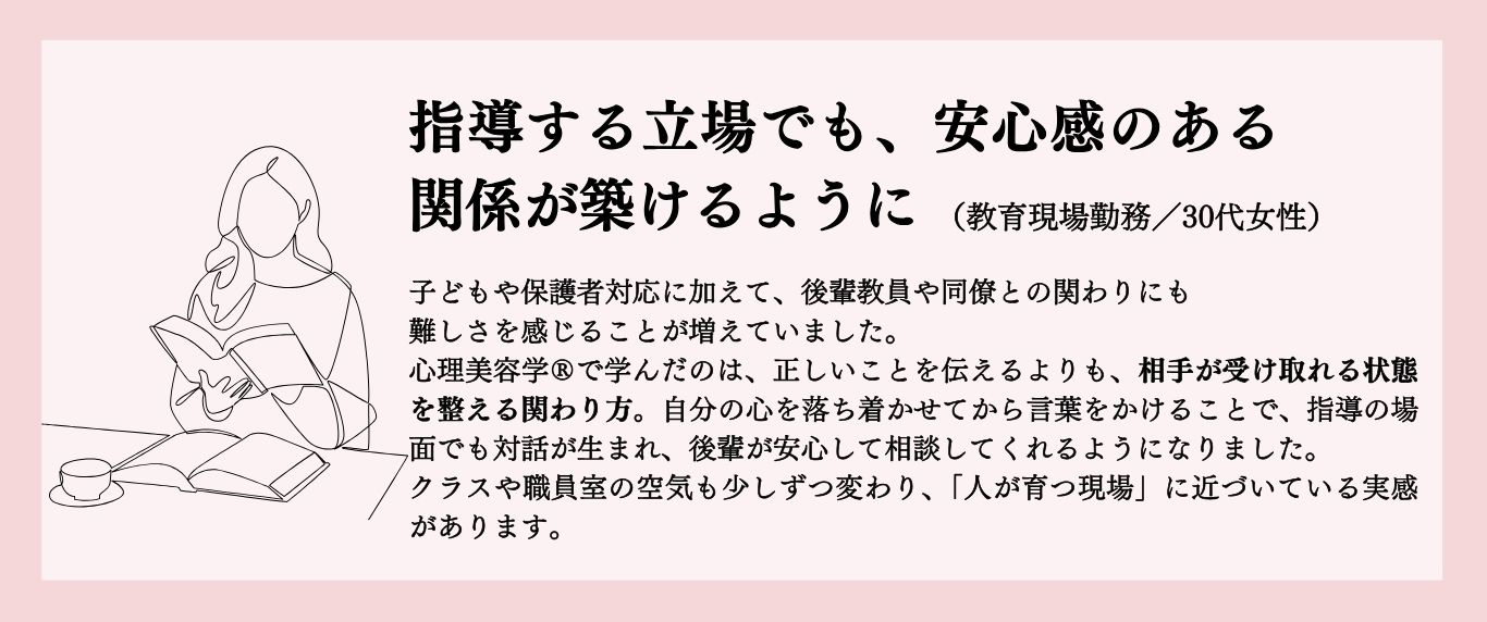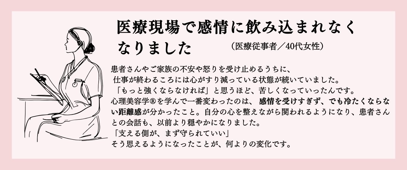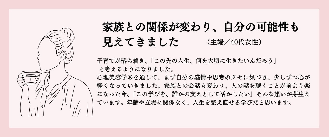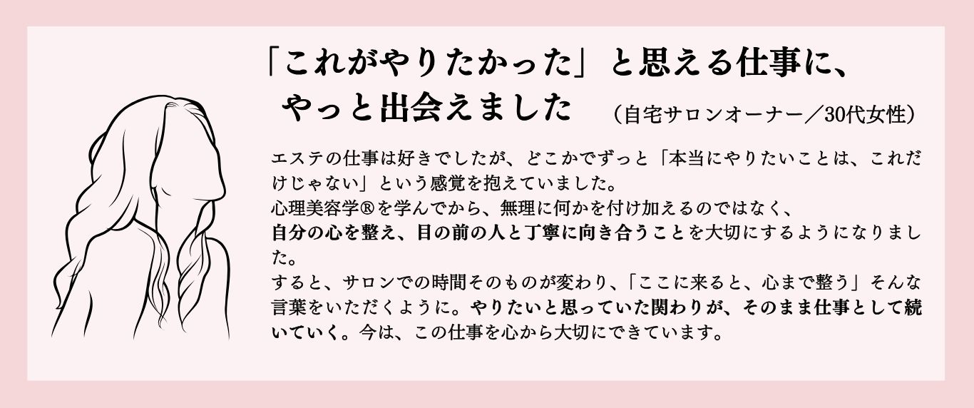 その経験をもとに体系化されたのが心理美容学®と心理美容カウンセラー®の育成プログラム。現場のリアルを知っているからこそ、・実践で使える・クライアントに届く・仕事として成立する「本当に価値のある学び」にこだわっています。