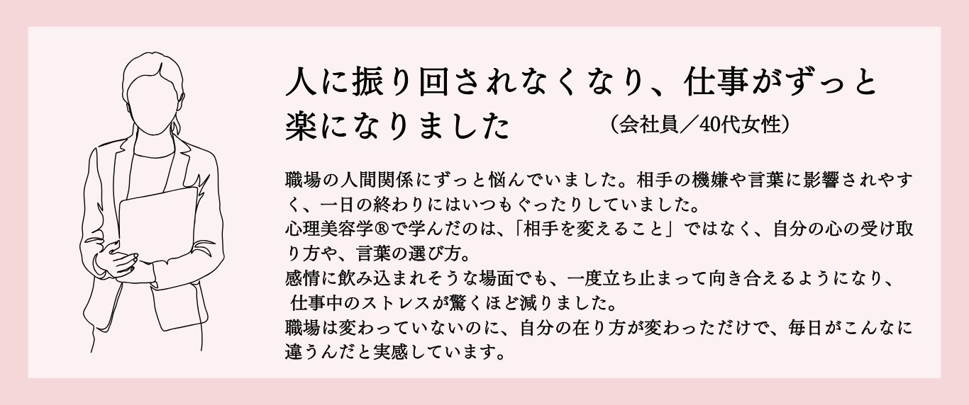 心と言葉力の専門家としてキャリアを築く、現場で使えるメンタル力と、伝わるコミュニケーション力を身につけ、心と言葉の専門性を、あなたの仕事の強みにする。心理美容カウンセラー®育成プログラムです。