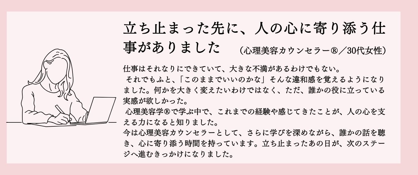日本心理美容カウンセリングアカデミーは、みなさんが自分自身を大切にしながら、現在の仕事や未来の可能性を見つめ直し、自分らしく生きる力を身につけるための場を提供しています。